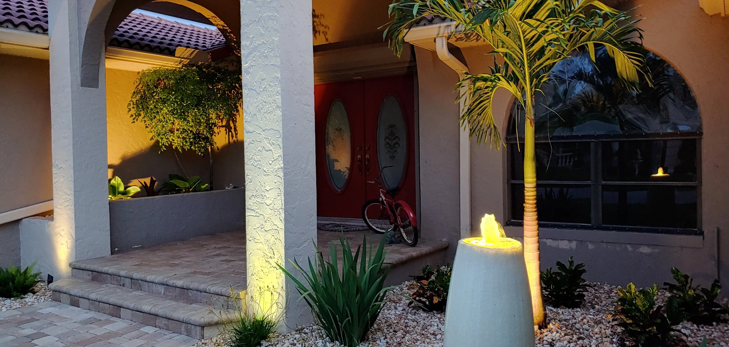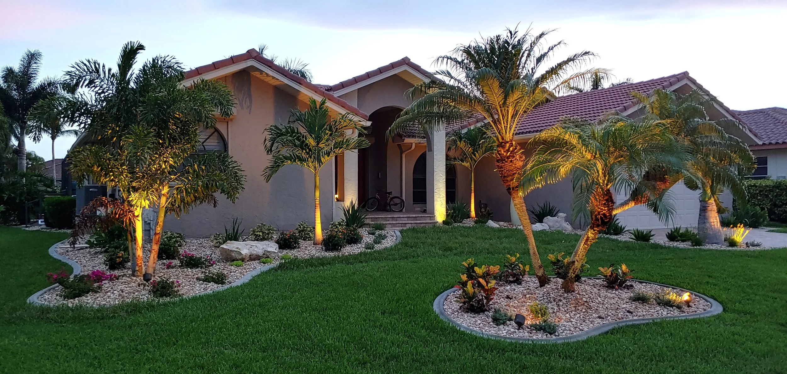 Our energy-efficient lighting systems add both beauty and functionality — improving visibility, safety, and curb appeal long after sunset. Subtle uplighting and soft washes create a resort-style glow that makes your home look polished, elegant, and ready for any evening gathering.
